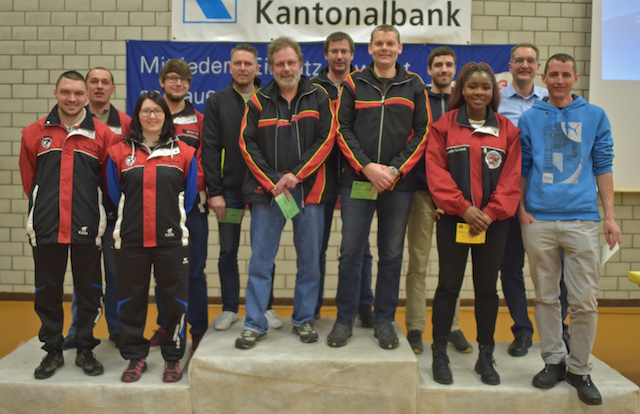 Sieg für die Gewehrschützinnen von Wettingen-Würenlos (Mitte, von links) Désirée Schaefer, Sandra Mäder-Stucker, Cécile Curschellas, Darunee Frossard) vor Muhen (links, mit Christiane Keller, Marc Schnider, Marion Obrist, Rolf Denzler) und Zufikon (rechts, mit Rafael Bereuter, Stefan Bereuter, Matthias Stöckli, Marcel Brumann). Fotos: wr