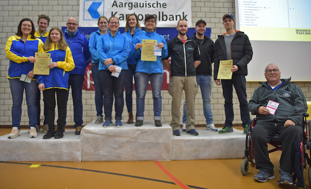 Sieg für die Gewehrschützinnen von Wettingen-Würenlos (Mitte, von links) Désirée Schaefer, Sandra Mäder-Stucker, Cécile Curschellas, Darunee Frossard) vor Muhen (links, mit Christiane Keller, Marc Schnider, Marion Obrist, Rolf Denzler) und Zufikon (rechts, mit Rafael Bereuter, Stefan Bereuter, Matthias Stöckli, Marcel Brumann). Fotos: wr